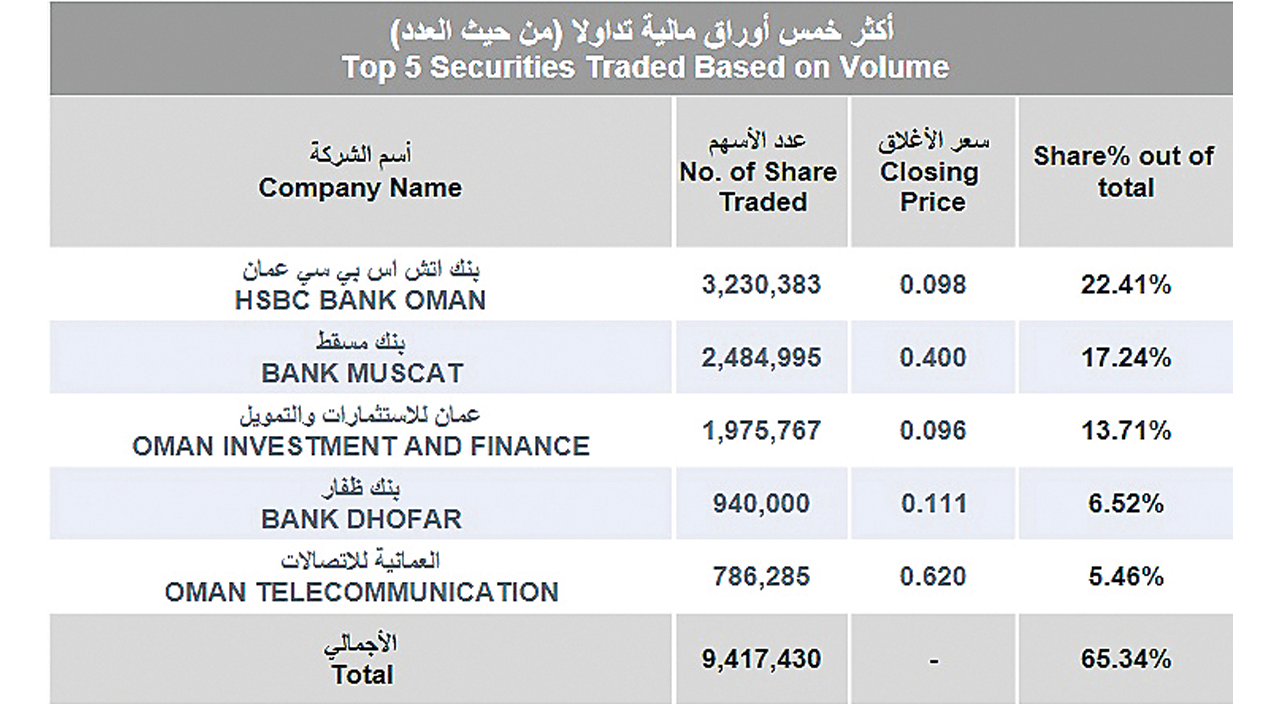 شهدت جلسة أمس تداول 9.4 مليون سهم، حيث استحوذ سهم بنك اتش اس بي سي عمان على 22% من حجم التداولات، وبلغت عدد الأسهم المتداولة 3.2 مليون سهم، ثم بنك مسقط بنسبة 17% وبحجم 2.4 مليون سهم، وعمان للاستثمارات والتمويل بنسبة 13.7%، وبحجم 1.9 مليون سهم، وبنك ظفار بنسبة 6.5%، وبحجم 940 ألف سهم، والعمانية للاتصالات بنسبة 5.4% وبحجم 786 ألف سهم.