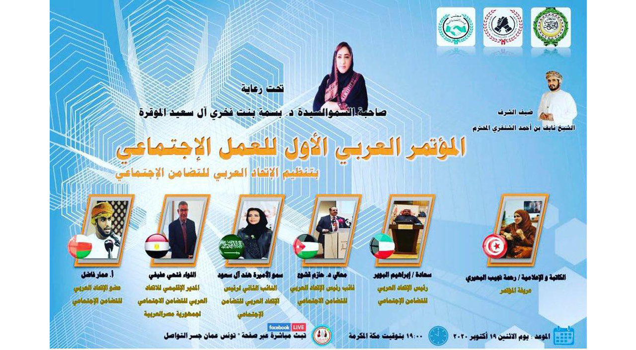 ينظم الاتحاد العربي للتضامن الاجتماعي مساء الاثنين القادم عبر تطبيق زووم المؤتمر العربي الأول للعمل الاجتماعي تحت رعاية صاحية السمو السيدة الدكتورة بسمة بنت فخر آل سعيد بحضور شرفي الشيخ نايف بن أحمد الشنفري ومشاركة عدد من أعضاء مجلس إدارة الاتحاد العربي للتضامن الاجتماعي، لتسليط الضوء على دور الاتحاد وأهدافه في تعزيز ورفد التعاون البناء بين الدول العربية في المجالات المختلفة للعمل الاجتماعي