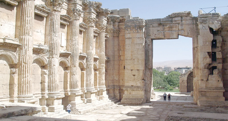 ونظراً لموقعها الجغرافي الاستراتيجي وأهميّتها الزراعية، أصبحت في عام 47 ق.م. مستعمرة رومانية بأمر من يوليوس قيصر والموقع المختار لبناء أكبر الهياكل الرومانية كمعبد باخوس التي عكست ثروة وقوة الإمبراطورية الرومانية. وقد استمرت عمليات البناء أكثر من مائتي عام وأشرف عليها أباطرة رومانيون مختلفون. ومن أجل الوصول إلى هذه الهياكل، لا بد للزائر أن يمر أولا بالأروقة الرومانية الضخمة وبساحتين تحيط بهما الأعمدة المهيبة.
