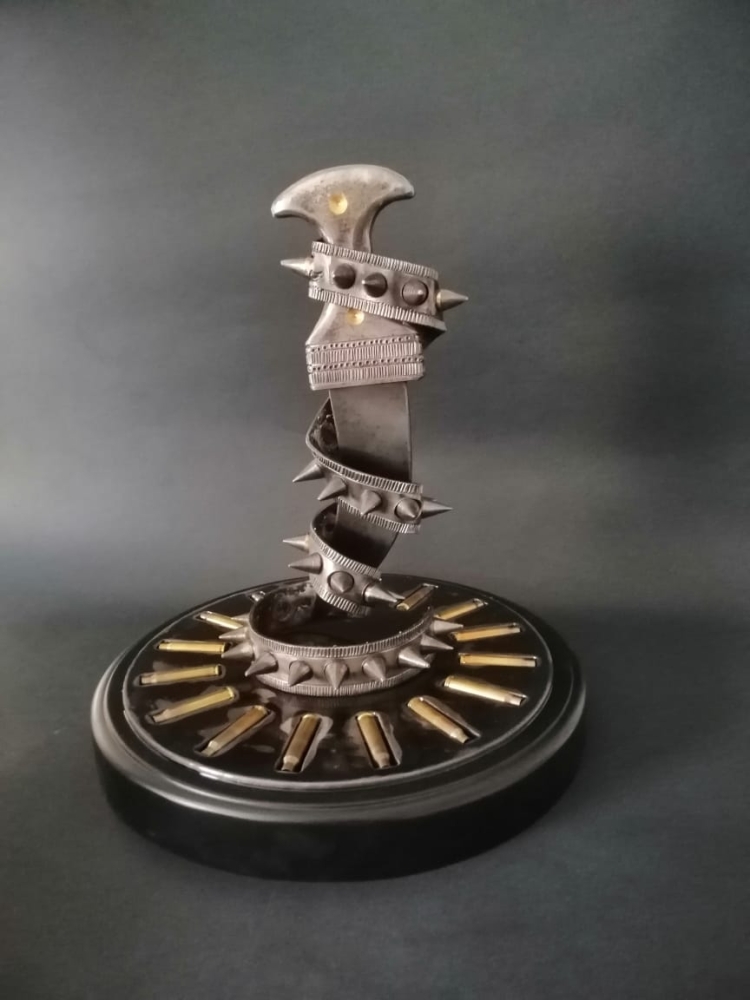 أعمال فنية جميلة تخاطب الشباب وتقدم رسائل هادفة وبناءة في النحت على الحديد والذي يلامس التراث العماني الأصيل كالخنجر العمانية والبنجري والمرية وأعمال فنية جميلة مستوحاة من المجتمع العماني الأصيل.