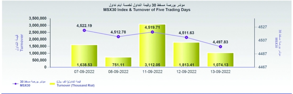 واصلت بورصة مسقط تراجعها لليوم الثاني على التوالي خلال جلسة أمس بمقدار 13.8 نقطة وبنسبة 0.3%، وأغلق المؤشر عند 4497.8 نقطة، كما انخفضت قيمة التداول إلى مليون ريال وبنسبة 40.8% مقارنة مع آخر جلسة تداول والتي بلغت 1.8 مليون ريال، وبلغت القيمة السوقية 23.2 مليار ريال عماني.