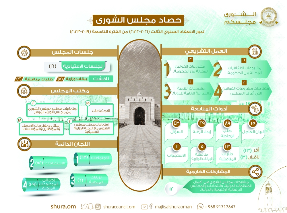 وأفاد سعادة الأمين العام للمجلس، بأن مجلس الشورى عكف خلال دور الانعقاد السنوي الثالث (2021-2022) من الفترة التاسعة (2019-2023) على إنجاز العديد من الموضوعات تضمنتها مشروعات القوانين والتقارير وأدوات المتابعة، حيث عقد (16) جلسة اعتيادية، ناقش فيها (5) بيانات وزارية، وأقر خلالها (10) من مشروعات القوانين والاتفاقيات المحالة من الحكومة منها: مشروع الميزانية العامة للدولة للسنة المالية 2022م، ومشروع قانون الأوراق المالية، ومشروع تعديل بعض أحكام قانون الوثائق والمحفوظات الصادر بالمرسوم السلطاني رقم 60/2007، ومشروع تعديل بعض أحكام قانون الكُتاب بالعدل، ومشروع اتفاقية بين حكومة السلطنة وحكومة جمهورية المجر حول التشجيع والحماية المتبادلة للاستثمارات، ومشروع اتفاقية تنظيم خدمات النقل الجوي بين حكومة سلطنة عُمان وحكومة جمهورية طاجيكستان، ومشروع اتفاقية ربط أنظمة المدفوعات بين حكومة سلطنة عمان ودول مجلس التعاون لدول الخليج العربية، هذا إضافة إلى مشروع اتفاقية الخدمات الجوية بين حكومة سلطنة عمان وحكومة جمهورية اتحاد ميانمار، ومشروع اتفاقية الخدمات الجوية بين حكومة سلطنة عمان وحكومة جمهورية السنغال، ومشروع اتفاقية تنظيم خدمات النقل الجوي مع حكومة جمهورية البرازيل الاتحادية، كما أقرَّ المجلس (2) من مقترحات مشروعات القوانين.