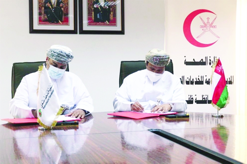 وقَّع الاتفاقية من جانب وزارة الصحة الدكتور خالد بن محمد المشيخي مدير عام المديرية العامة للخدمات الصحية لمحافظة ظفار ومن جانب شركة تنمية نفط عُمان المهندس محمد بن أحمد الغريبي مدير الشؤون الخارجية والاتصالات بالشركة.