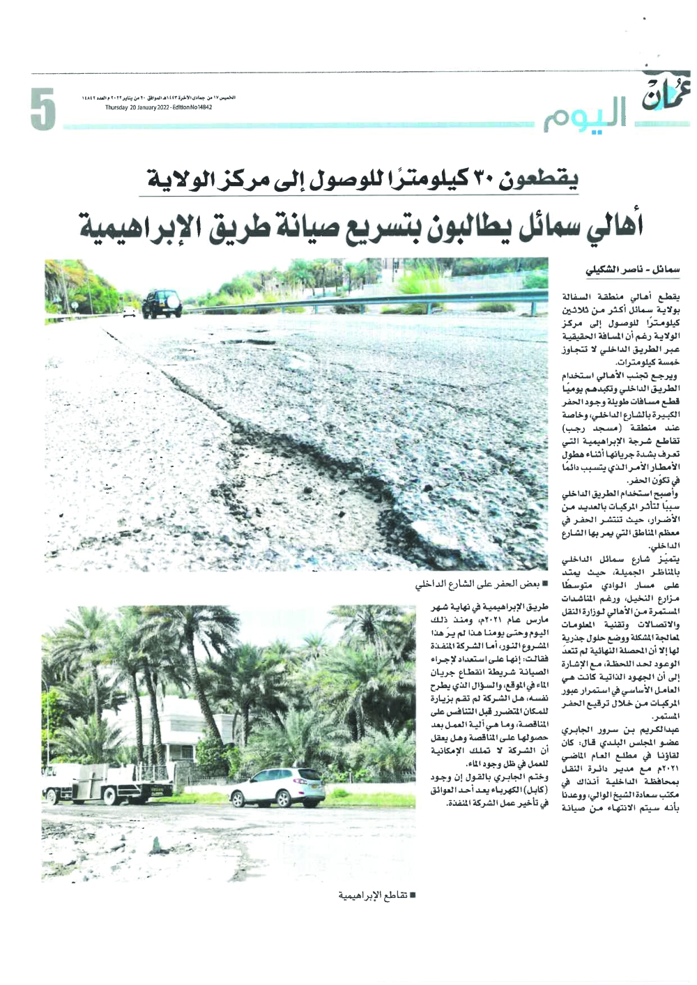 كما أكدت الوزارة أنهـا بـدأت في العمل عـلى إصـلاح الأضرار عـلى طريـق الإبراهيمية بولاية سمائل، وذلـك مـن خـلال استبدال الأسفلت المتضررة بأخرى جديدة، وذلك في رد على المنشور الصـادر في عـدد رقم ( ١٤٨٤٢ ) تحـت عنــوان (أهالي يطــالبون صــيانة طريـق الإبراهيمية).